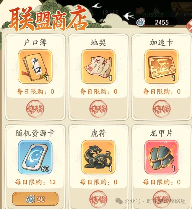2、联盟商店-除了户口,地契,项羽碎片必买,剩下的自己看联盟贡献自己分配购买。