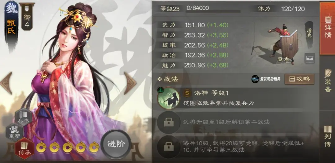 甄姬,魏国4御盾兵,智力成长好,统率成长略差。