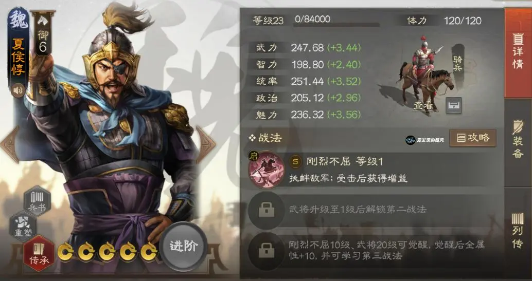夏侯惇,魏国6御骑兵,属性除了智力都还算不错。